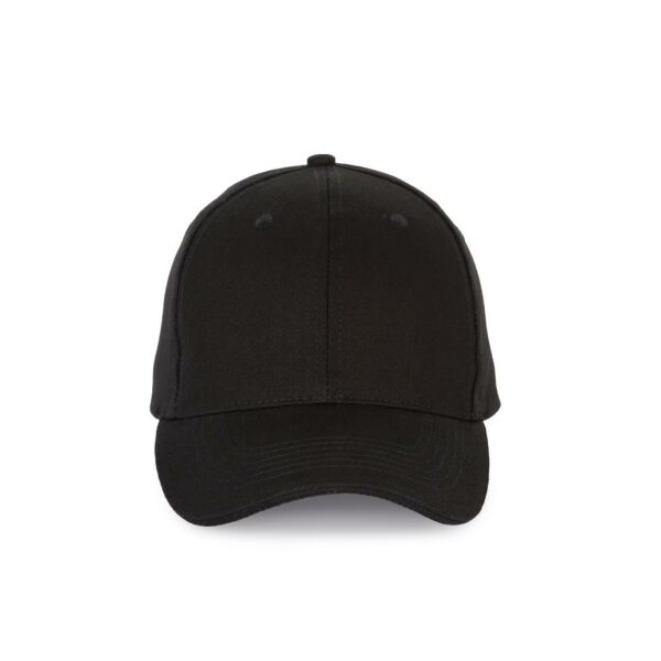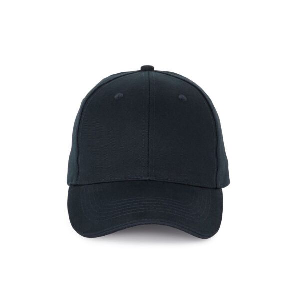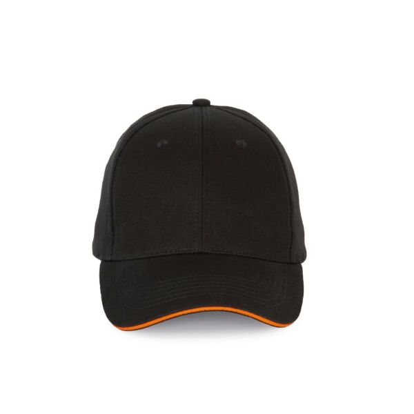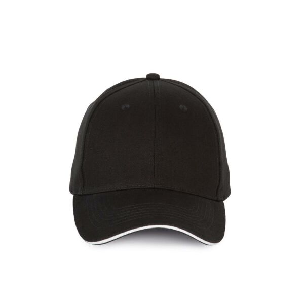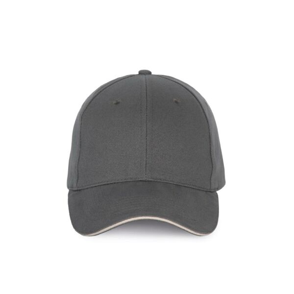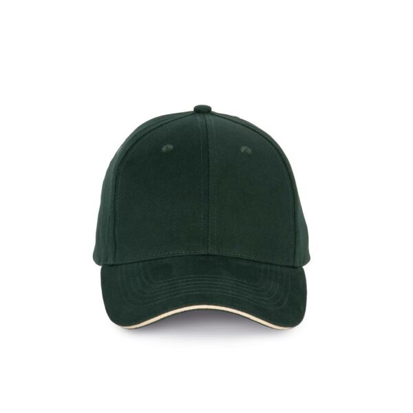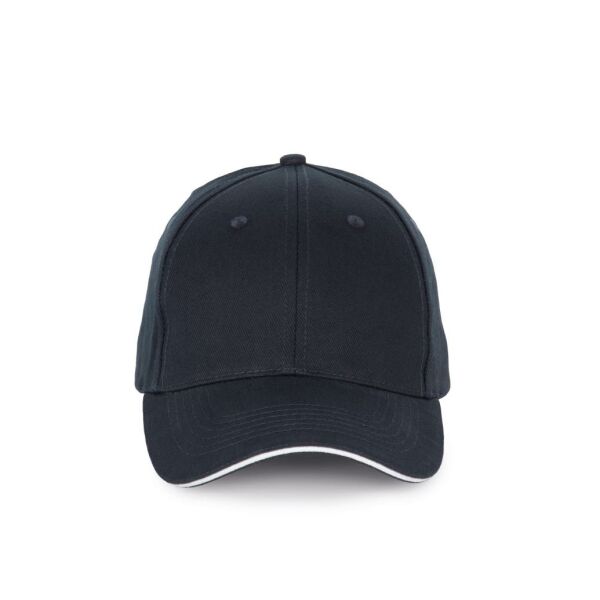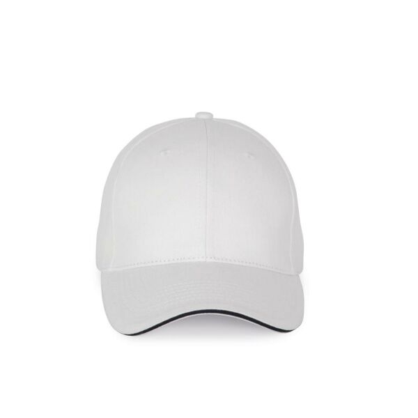 100% katoen. Pet met 6 panelen en contrasterende bies. Verstelbare sluiting met metalen gesp en zelfblokkerende lus.